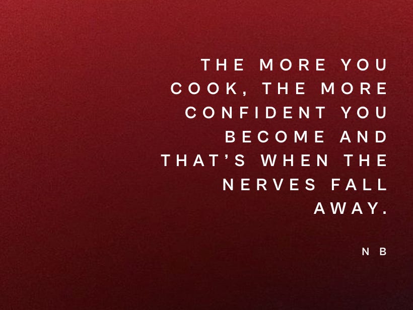 When I cook, I don’t want it to feel like a performance. I want it to feel comfortable and instinctual. That’s when it feels like love — both from your perspective and for those you cook for. The key to being comfortable? Cooking more. I’ve just been doing it a long time, so it comes naturally to me. But it can become whatever level of natural you want it to be.