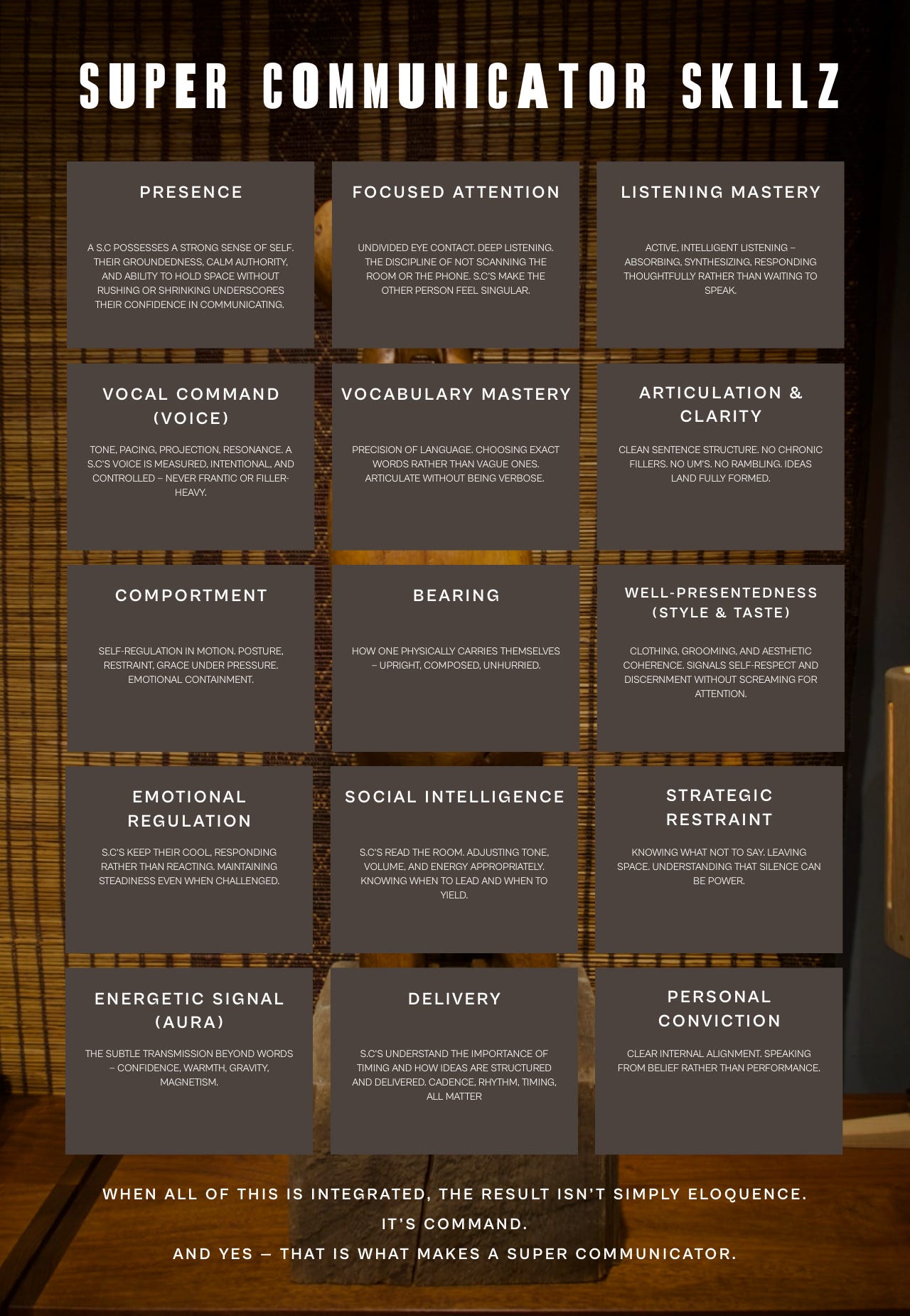 t’s knowing what to say — or not — when to lean in or step back, and sometimes when to let someone else take center stage. Restraint, too, is a hallmark of the skilled communicator — the discipline to listen fully before responding. When to hold eye contact — or release it. It shows up in your posture, what you wear, and yes, even in your home. Your stage is wherever you are.