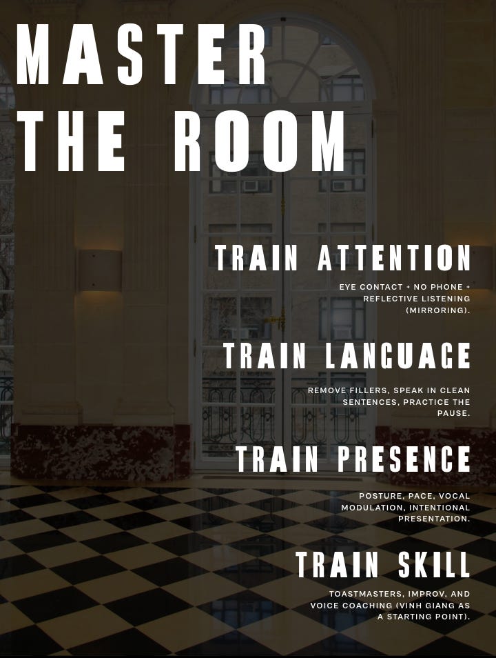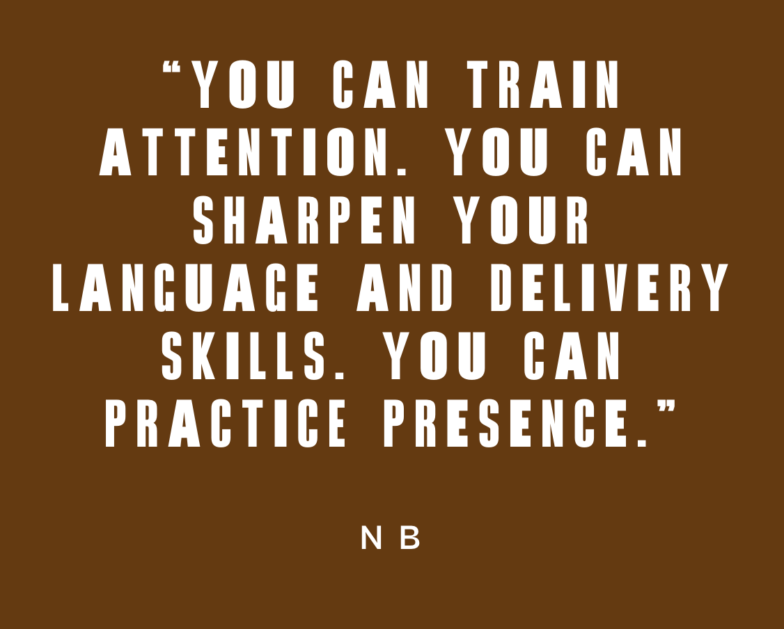 You can train attention. You can sharpen your language and delivery. You can practice presence. But start with the rarest thing: being fully with someone. Put the phone away. Hold eye contact longer than you naturally would. Let someone finish their thought before you jump in. Repeat back one key point before offering your own — not to mimic, but to confirm understanding. It changes everything.